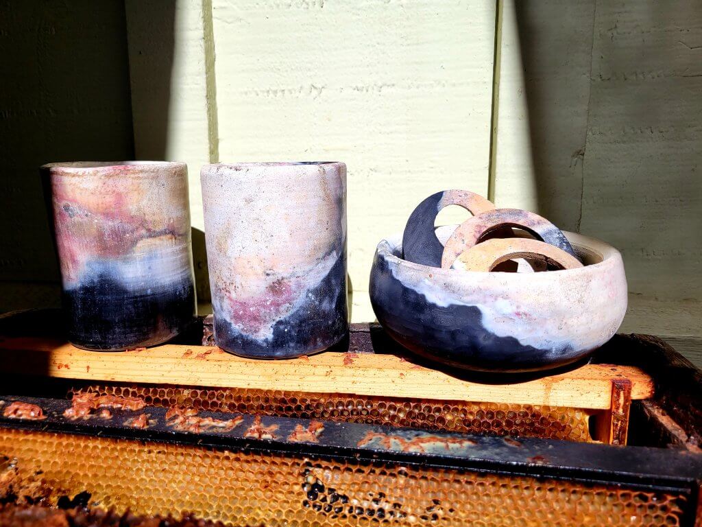 in this Firing we used Primarily Banana peels, Walnut shells, Steel wool, Pistachio shells but there was quite the varity from what everyone brought with them